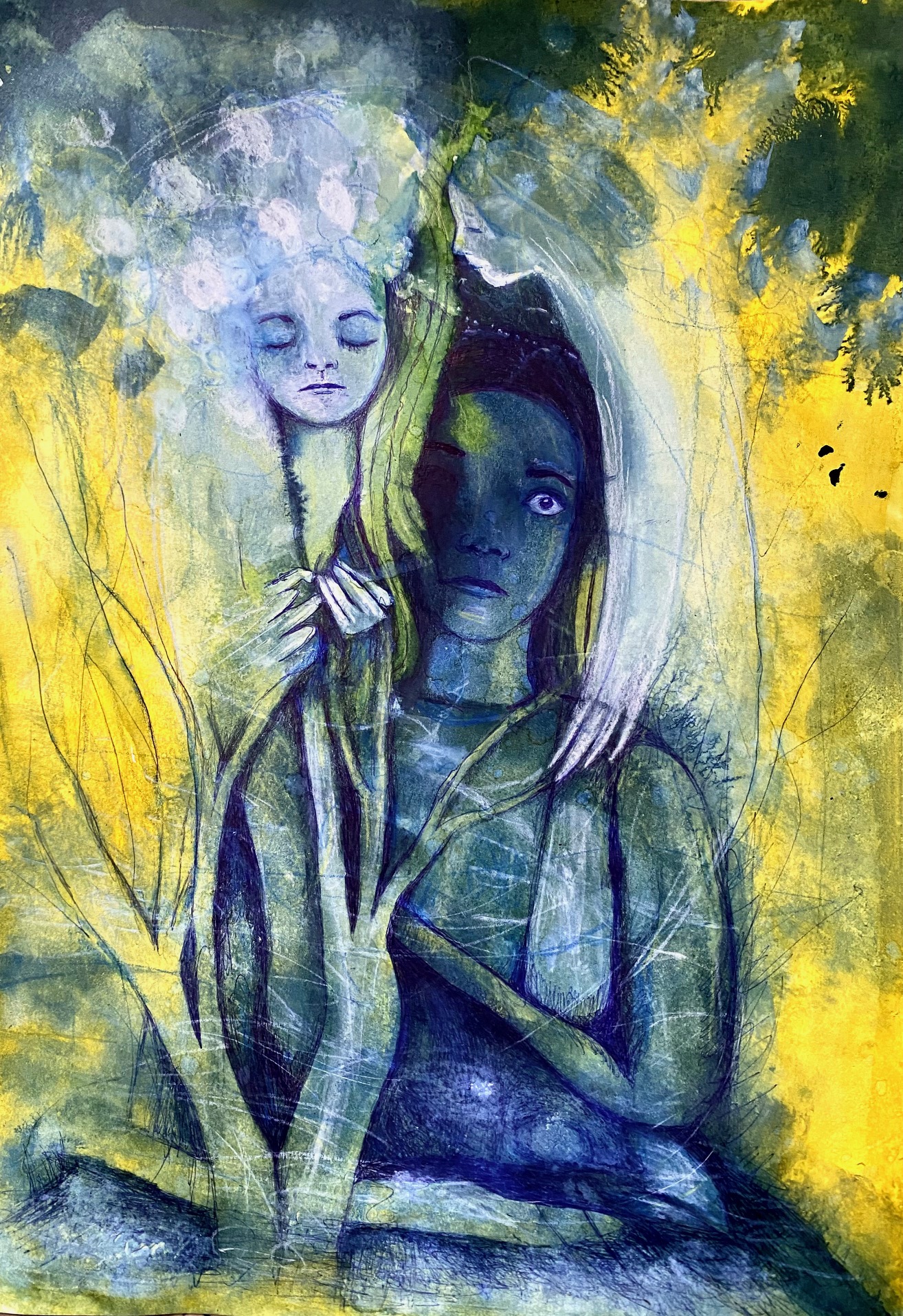 Petite fille et l’arbre 2023 Techniques mixtes sur carton entolé 27X42cm