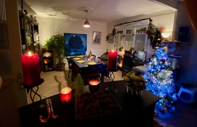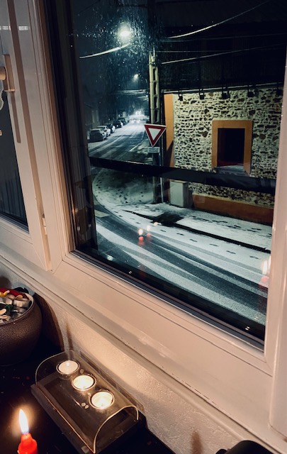 Cette année, les fêtes de Noël ont été des moments simples, il le fallait. Nous étions tous les 4 au réveillon, mon conjoint et mes deux (grandes) filles. J’étais particulièrement contente de ma petite déco avec des branches de sapin naturel. Chez moi, l’hiver rime avec besoin de lumières et de bougies le jour du réveillon : je me suis fait plaisir. C’est tellement réconfortant et chaleureux. Et quelle fut notre surprise quand – au petit matin en ouvrant le store – le jardin était recouvert de neige. La joie m’a envahie…