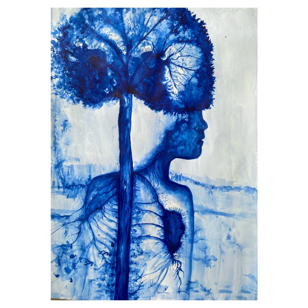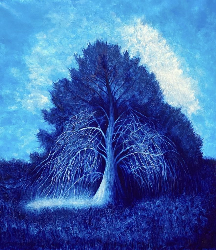 Cette couleur est venue à moi comme une évidence. Elle m’a redonnée le goût de créer durant la période post-Covid. J’étais alors en plein doute et remise en question de tout mon parcours. J’avais besoin d’apaisement et de sérénité et cette couleur a été un vrai soutien. Je suis tombée amoureuse du bleu de Prusse. Il m’a permis de me recentrer. Les arbres bleus sont devenus un sujet d’études. Un sujet à comprendre, appréhender et bien plus que cela encore… Ils ont trait au spirituel, à ce qui dépasse notre condition d’être humain et notre vision du monde.