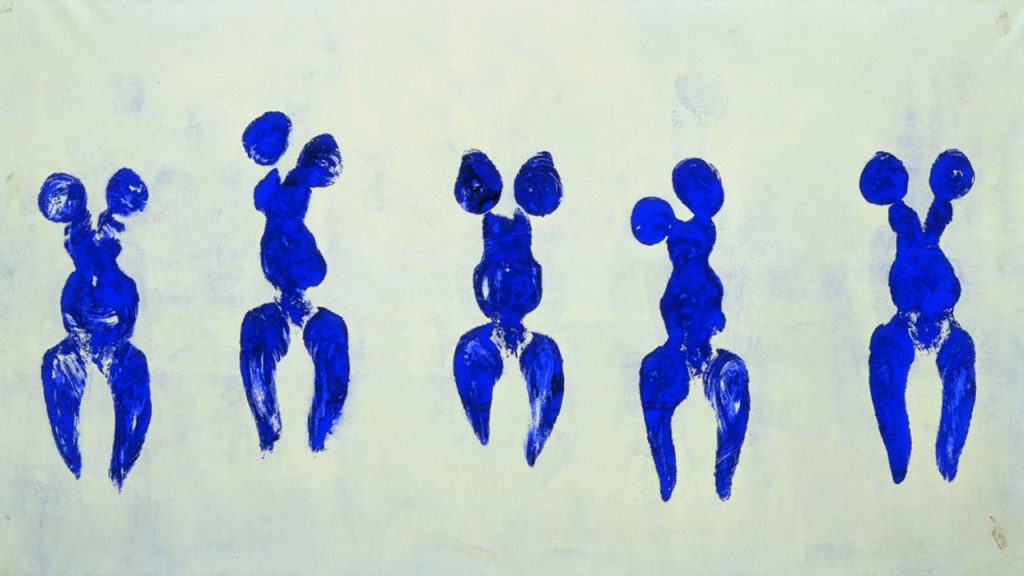 Le bleu attire, il est magnétique. L’artiste français Yves Klein a même déposé a déposé la formule du pigment et du liant de son propre bleu, le IKB (International Klein Blue). Un bleu outremer devenu emblématique de ses œuvres notamment avec ces corps de femmes utilisés comme pinceaux vivants7 dans sa série Anthropométrie.
