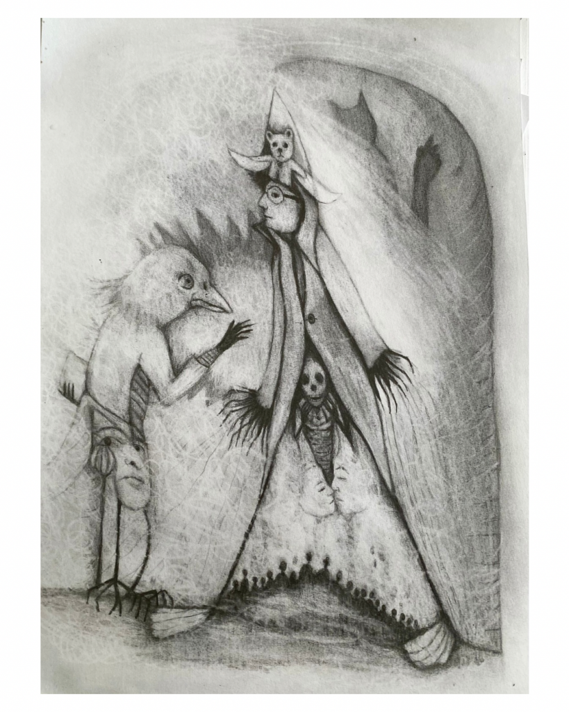 C’est le cas de ce dessin… Certains y verront un autoportrait, ce n’était pas conscient au début, puis j’ai creusé cette idée. Vêtue d’un long manteau, mes jambes d’échasse sont chaussées de palmes. Mon manteau abrite un monde assez étrange : un couple qui s’embrasse avec des silhouettes qui forment un paysage en arrière plan. Dans mon chapeau pointu se cache un ours vêtu d’une cape, un oiseau, avec un visage au niveau de son ventre, m’interpelle et cache un papier derrière son dos.