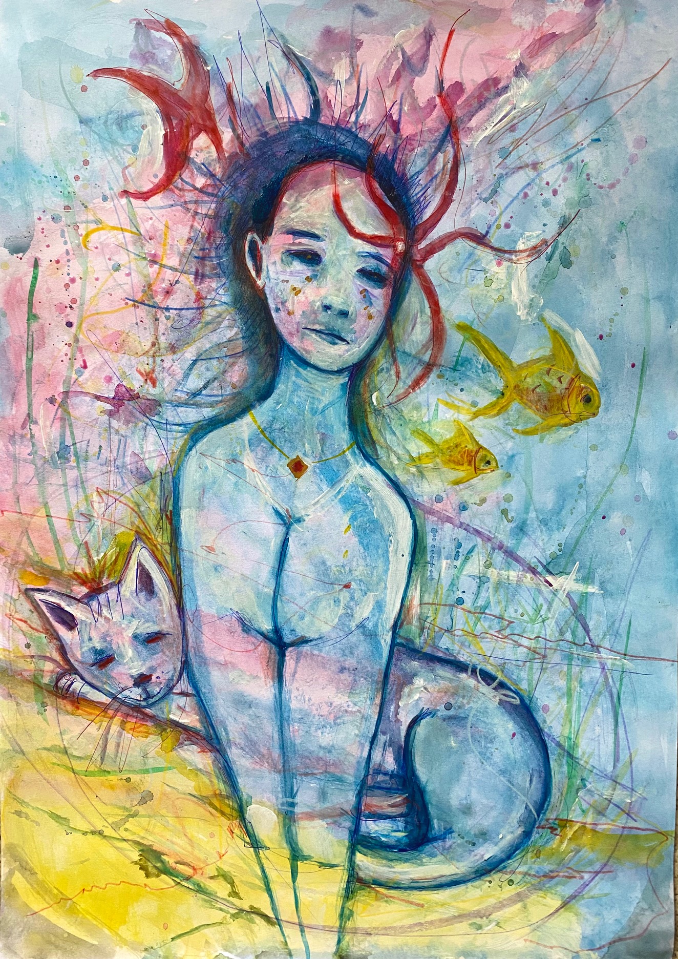 Partie d’un paysage d’un ciel magnifique du petit matin. Cette femme au buste-fessier a des choses à dire semble t-il. Deux poissons nagent dans le ciel hors d’atteinte d’un chat imperturbable aux yeux rouges… Une psychanalyse ? qu’importe l’histoire : l’image parle… seule…